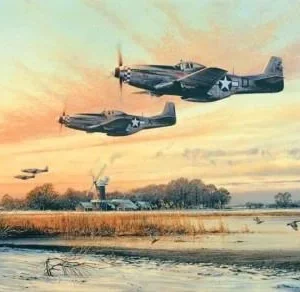 The Painting: Late afternoon 9 July 1940 Red and Yellow sections of No. 54 Squadron, RAF were patrolling the Dover-Deal area just off the coast of England where 15 Bf 109 E’s were sighted. A head-on fight developed between two pilots with neither giving in, both firing as they closed in, both machines receiving hits. Al Deere’s windshield filled with the approaching German aircraft and then the terrifying grinding blow as the 109 slammed into the Spit’s propeller blades stopping the engine. Eventually he was able to bring his crippled aircraft onto the ground crashing through anti-invasion posts skidding to a halt in a cornfield. The Bf 109 was splashed and claimed as a victory.
